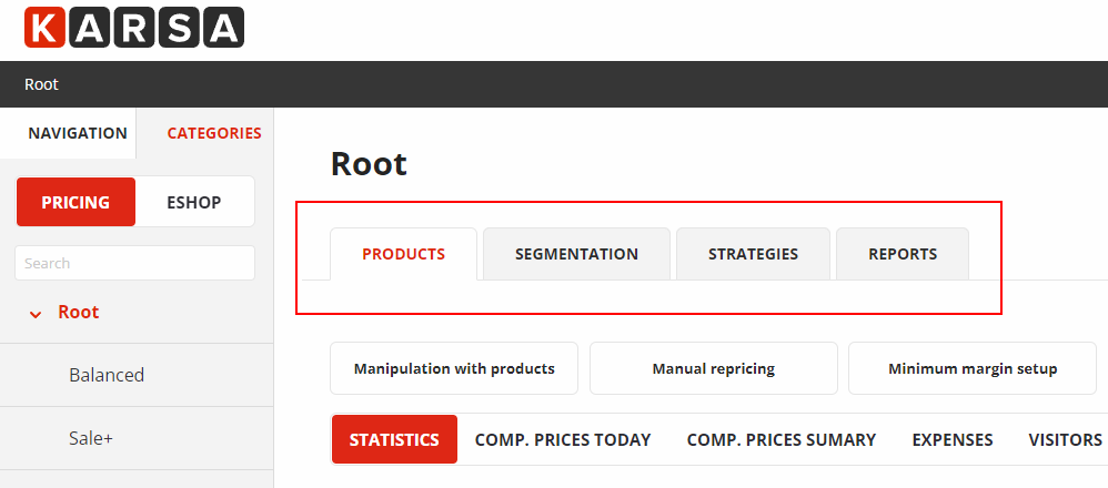 Záložka obsahuje výpis produktů pro vybranou kategorii. Produkty lze analyzovat, porovnávat časové období, upravovat sloupce ve výpisu produktů, měnit inicializační cenu, minimální marži, měnit cenové strategie a další operace. Detailněji je výpis produktů popsán v samostatné sekci.