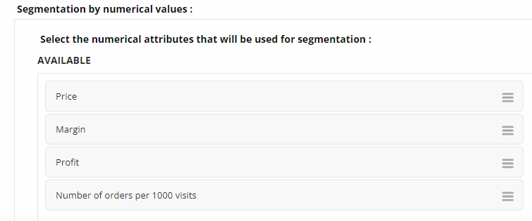 Produkty jsou segmentovány podle rozsahu hodnot produktů vybraného atributu. Pokud je cena výrobků v rozmezí 100-1000, vytvoří se například 4 segmenty. Vhodné použití je například segmentace dle výrobce a ceny, kdy se zjišťuje prodejnost produktů s různou cenovou hladinou a to dle jednotlivých výrobců.