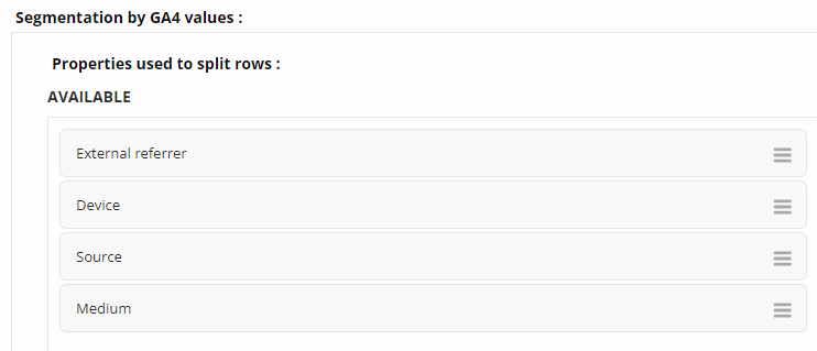 <figure><img src="https://content.gitbook.com/content/L0T6chPkMIOVj7QdyKqF/blobs/zKfXCtFEb0BuqSfU8cRx/image.png" alt=""><figcaption><p><em>Segmentace dle GA4 atributů</em></p></figcaption></figure>