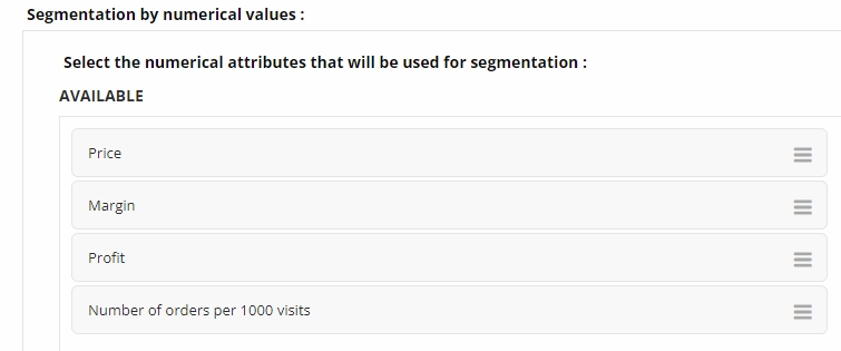 Dle číselných hodnot produktů Produkty jsou segmentovány podle rozsahu hodnot produktů vybraného atributu. Pokud je cena výrobků v rozmezí 100-1000, vytvoří se například 4 segmenty. Vhodné použití je například segmentace dle výrobce a ceny, kdy se zjišťuje prodejnost produktů s různou cenovou hladinou a to dle jednotlivých výrobců.