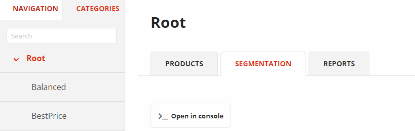 #### V libovolné cenové, e-shopové kategorii nebo produktové skupině kliknete na adresář a zvolíte záložku „SEGMENTATION“.  Produkty obsažené ve zvoleném adresáři budou použity pro analýzu. Pokud zvolíte adresář ROOT, tak jsou zahrnuty všechny produkty obsažené v obchodu.<br>