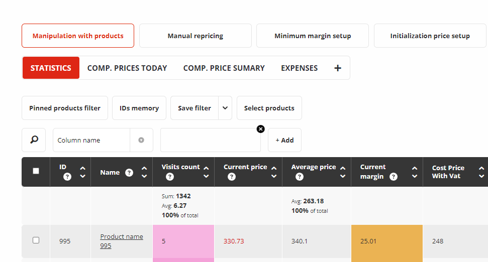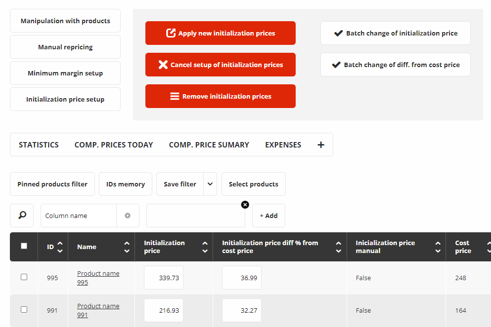 V administrátorském prostředí. Zde je možné v tabulce nastavit přesnou inicializační cenu nebo nastavit odchylku od nákupní ceny. Je zde ta také dostupná možnost hromadné změny inicializačních cen u produktů označeným check boxem. Pokud je u produktu nastavena inicializační cena ručně, stává se inicializační cena manuální. To znamená, že již není upravována její hodnota od strategie. To je vhodné, pokud chcete docílit její neměnnost. Může být, ale stále vypočítávána výkonnostní odchylka produktu.