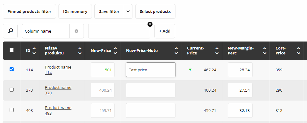 Na produkty ve výpisu produktů lze aplikovat jednotlivé "akce". Produkty mohou být označeny checkbox, a následně budou po zobrazení stránky vybrány jako první nebo se zobrazí celý výpis produktů, který lze dále filtrovat.