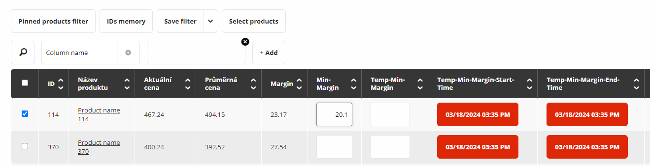 Nastavení minimální marže v administrátorském prostředí. Zde je možné nastavit i dočasnou minimální marži, která se přestane používat po uplynutí stanovené doby. Následně je použita standardní minimální marže produktu. Dočasná minimální marže se používá nejčastěji u nových produktů, kdy u nového produktu je požadavek udržovat vyšší cenovou prodejní hladinu.
