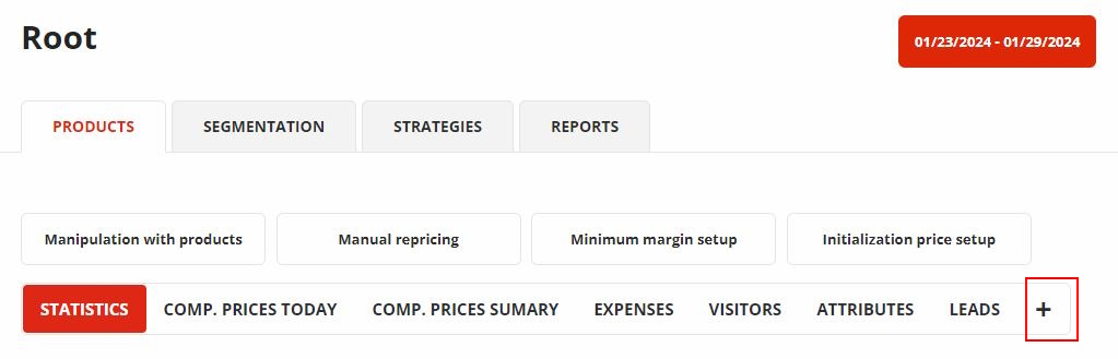 <figure><img src="https://content.gitbook.com/content/L0T6chPkMIOVj7QdyKqF/blobs/tSapyPPt1mM9Zu4ZBFGF/Vypis%20Produktu.JPG" alt=""><figcaption><p><em>Záložky v výpisu produktů. Červeně je označeno tlačítko plus, které zobrazí dialog na modifikaci sloupců</em><br></p></figcaption></figure>