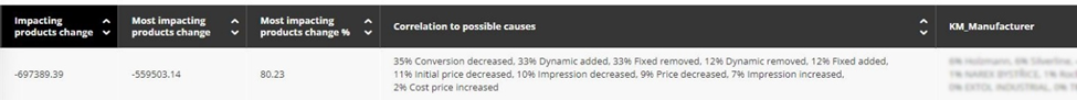 Correlation to possible causes – Možné příčiny poklesu nebo růstu u vybraných produktů. Díky tomuto sloupci lze dále lépe zaměřit další hledání/analýzy příčin poklesu nebo růstu u vybraných produktů. Některé příčiny mohou být sekundární, například pokles cenového pořadí produktů a s tím související pokles konverze.
