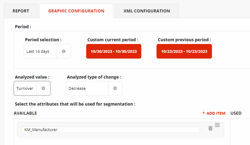 V nastavení lze vybrat vyhodnocení obratu, profitu a zda se má vyhodnocovat pokles nebo naopak růst. Zároveň lze použít atribut z importního XML a dle něho segmentovat produkty. Délka běhu reportu se pohybuje dle nastavení okolo 1-2 minut.